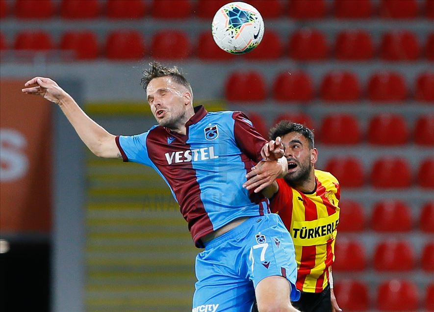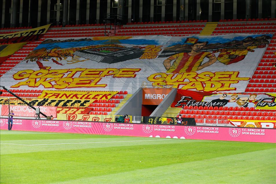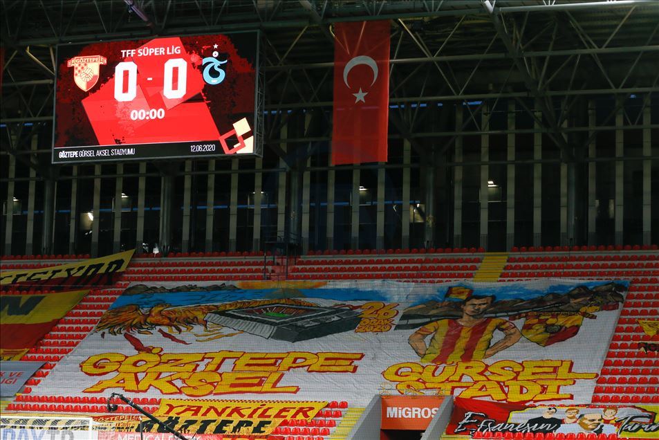 Süper Lig'in 27. haftasında Göztepe ve Trabzonspor takımları Gürsel Aksel Stadında karşılaştı. Yeni tip koronavirüs (Kovid-19) sebebiyle seyircisiz oynanan karşılaşmada pankartlar ve Göztepe formaları tribünlere bırakıldı. ( Ömer Evren Atalay - Anadolu Ajansı )Ömer Evren Atalay