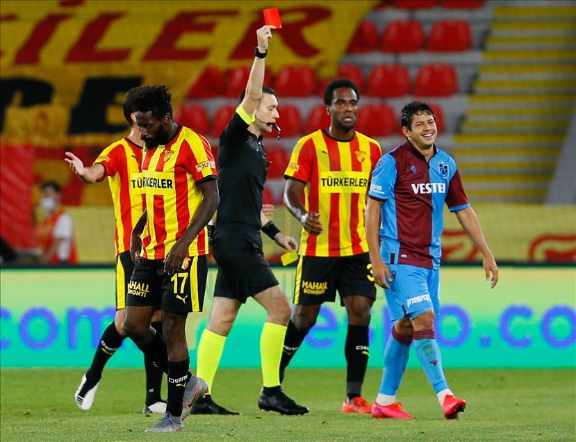 Süper Lig'in 27. haftasında Göztepe ve Trabzonspor takımları Gürsel Aksel Stadında karşılaştı. Trabzonspor'dan Guilherme Costa Marques (sağda) karşılaşmanın ilk yarısında hakem Zorbay Küçük'den (sağ 3) gördüğü iki sarı kart sonrası kırmızı kartla oyun dışı kaldı. ( Ömer Evren Atalay - Anadolu Ajansı )Ömer Evren Atalay
