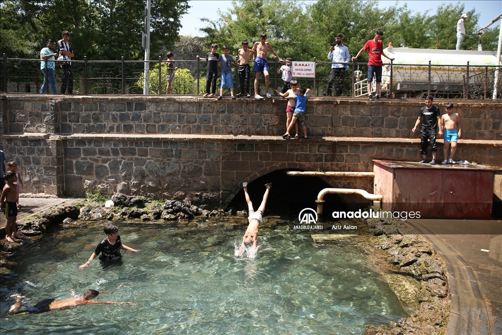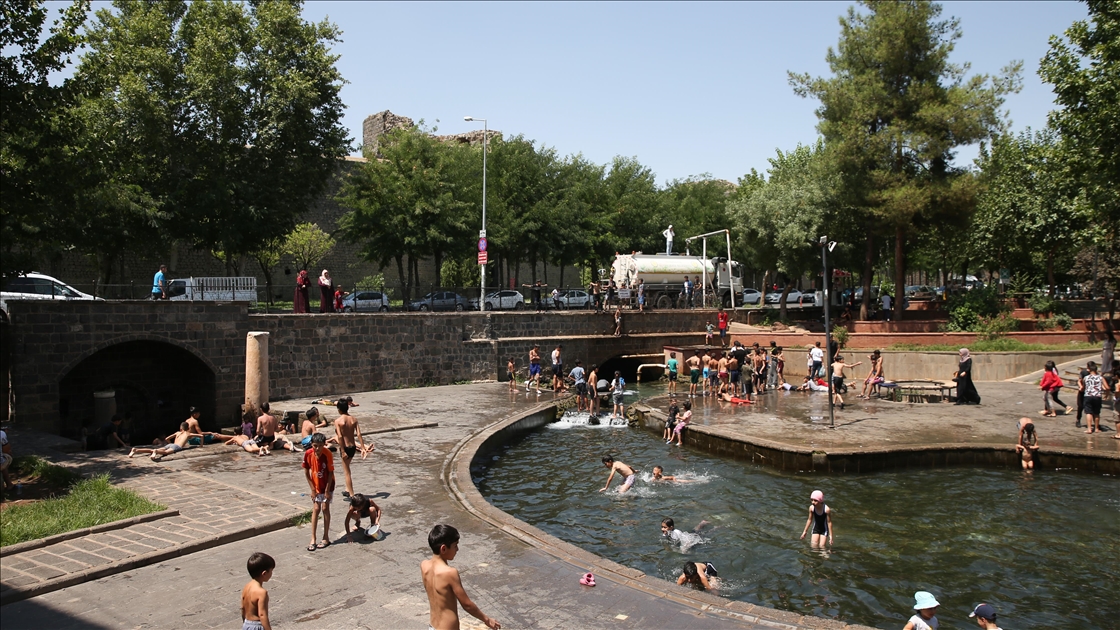 Güneydoğu Anadolu Bölgesi'nde 40 dereceyi aşan sıcak hava, yaşamı olumsuz etkiliyor. Bazı çocukları Diyarbakır merkez Sur ilçesindeki Anzele Parkı'nda bulunan süs havuzunda serinlemeye çalıştı. ( Aziz Aslan - Anadolu Ajansı )Aziz Aslan