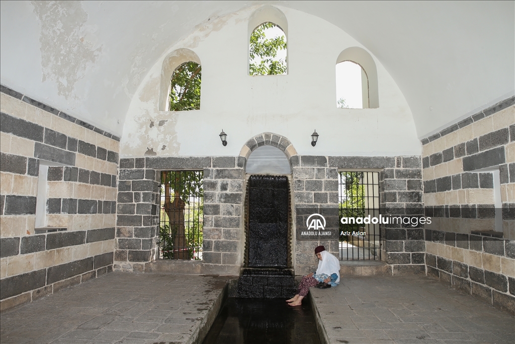 Güneydoğu Anadolu Bölgesi'nde 40 dereceyi aşan sıcak hava, yaşamı olumsuz etkiliyor. Diyarbakır'da yöresel kıyafet giymiş yaşlı kadının tarihi Gaziköşkü avlusundaki kaynak suyunda serinleyerek, dinlendiği görüldü. ( Aziz Aslan - Anadolu Ajansı )Aziz Aslan