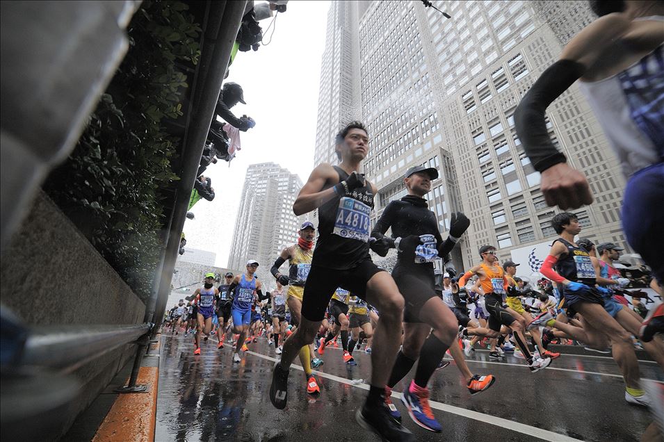 Atletizmde Boston, New York, Chicago, Londra ve Berlin ile beraber en büyük 6 maraton yarışından biri olan 42,195 kilometrelik mücadele, Japonya'nın başkenti Tokyo'da soğuk ve yağmurlu havada koşuldu. ( David MAREUIL - Anadolu Ajansı )David MAREUIL