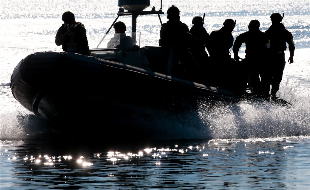 Mavi Vatan - 2019 Tatbikatı'nın Ege Denizi'ndeki 7'inci gününde senaryo gereği düşman kuvvetlerine ait olan Hekimli Adası'na çıkarma gemileri amfibi deniz piyade birlikleri, tank ve zırhlı araçlarını çıkarmadan önce SAT ve SAS kuvvetleri mayın tarama ve imha çalışması yaptı. ( Evren Atalay - Anadolu Ajansı )Evren Atalay