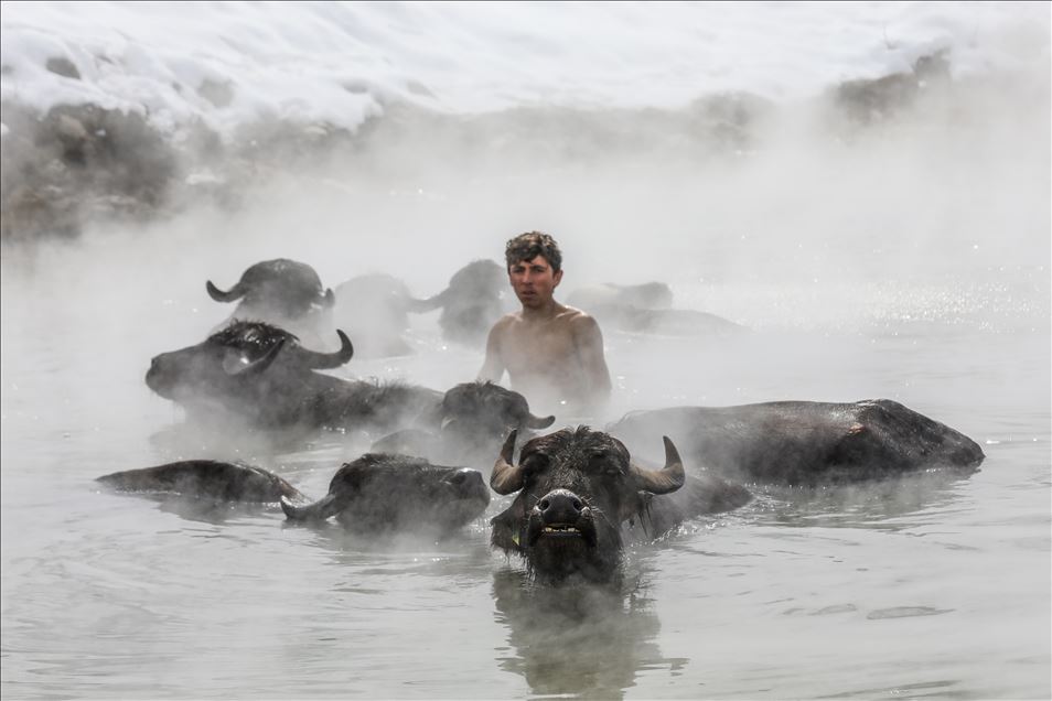 Dondurucu soğukta manda ve atların kaplıca keyfi