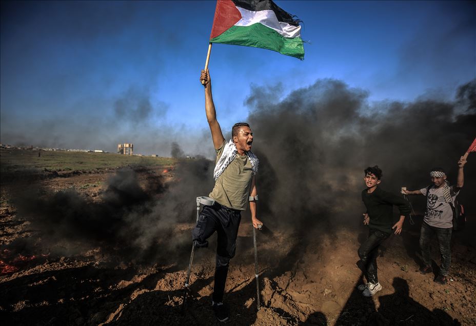 İsrail ablukası altındaki Gazze Şeridi sınırında düzenlenen barışçıl "Büyük Dönüş Yürüyüşü" gösterileri devam etti. Gazze'nin doğusunda yer alan Şucaiyye Mahallesi yakınındaki İsrail sınırında toplanan Filistinliler, gösteri düzenledi. İsrail güçlerinin gösteriye müdahale etmesi üzerine göstericiler, lastik yakarak karşılık verdi. Bazı Filistinliler, gösteriye koltuk değnekleri ile katıldı. ( Ali Jadallah - Anadolu Ajansı )Ali Jadallah
