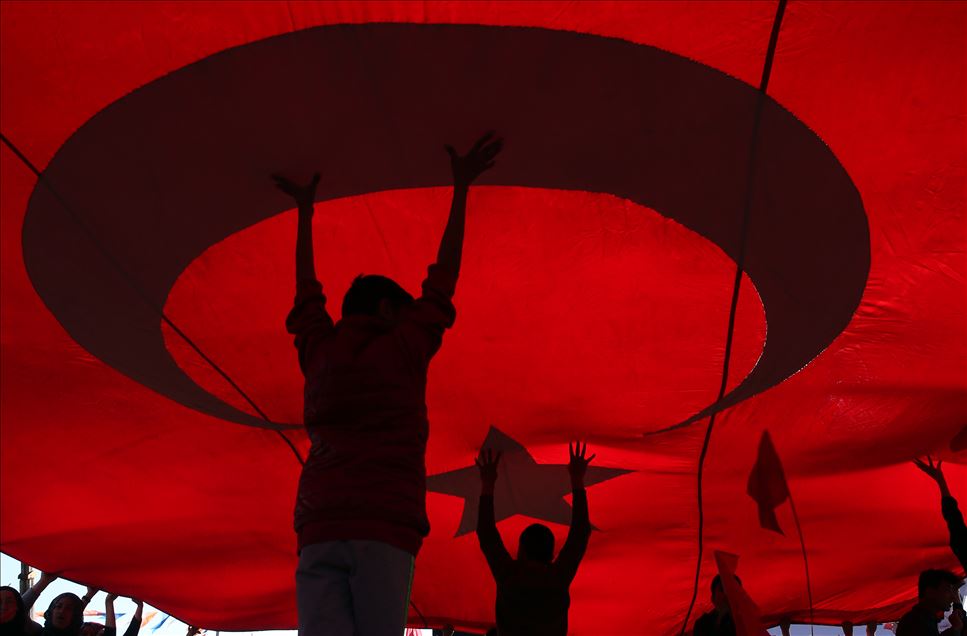 İçişleri Bakanı Süleyman Soylu, Seçim çalışmaları kapsamında Ankara'nın Sincan ilçesindeki Yenikent Meydanı'nda vatandaşlara seslendi. Bakan Soylu'nun konuşmasını dinleyen vatandaşlar dev Türk Bayrağı açtı. ( Evrim Aydın - Anadolu Ajansı )Evrim Aydın