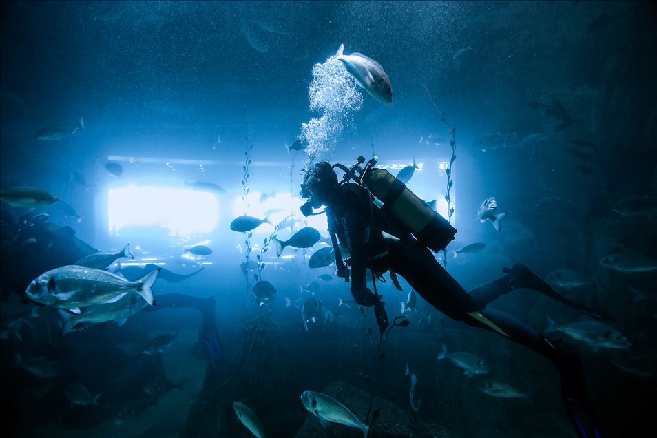 İstanbul Akvaryumu'nda çalışan dalgıçlar, deniz canlılarını beslerken akvaryumun bakım işerini de gerçekleştiriyorlar. Dalgıçlar akvaryumu ziyaret edenlerin de ilgi odağı oluyorlar. ( Erhan Sevenler - Anadolu Ajansı )Erhan Sevenler