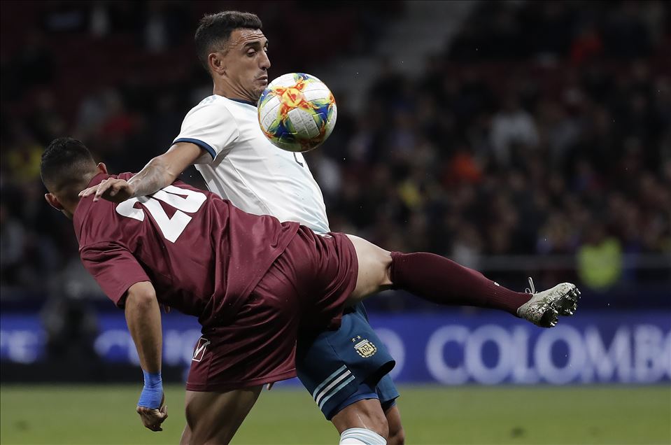 Arjantin ile Venezuela A milli futbol takımları hazırlık maçında, Madrid’deki Wanda Metropolitano Stadı'nda karşı karşıya geldi. Karşılaşmada, Arjantin milli takımının futbolcusu Matias Suarez (sağda), rakibi Ronald Hernandez (solda) ile mücadele etti.