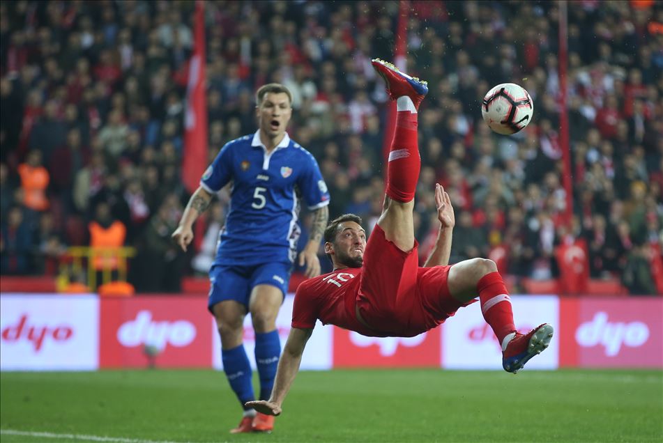 A Milli Futbol Takımı, 2020 UEFA Avrupa Futbol Şampiyonası Elemeleri'nde Moldova ile Yeni Eskişehir Stadı'nda karşılaştı. Bir pozisyonda Hakan Çalhanoğlu (10) rakibiyle mücadele etti. ( Ali Atmaca - Anadolu Ajansı )Ali Atmaca