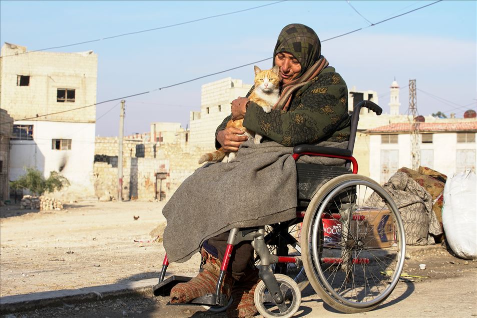 Suriye'nin İdlib ilinde Beşşar Esed rejimi ve destekçilerinin saldırılarında yaralanarak tekerlekli sandalyeye mahkum olan 60 yaşındaki İbtisam Said, yoğun bombardıman nedeniyle Maarratünnuman ilçesinde ayrılmak zorunda kalırken, baktığı kedilerden sadece birini yanında götürebildi. Sivil Savunma (Beyaz Baretliler) ekiplerinin yardımıyla ilçeden ayrılan Said, AA muhabirine açıklamlarda bulundu. ( Nasır Akıl - Anadolu Ajansı )Nasır Akıl