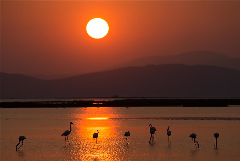 Dünyanın en önemli sulak alanları arasında yer alan Gediz Deltası'ndaki İzmir Kuş Cenneti, başta flamingo ve pelikanlar olmak üzere ev sahipliği yaptığı 291 kuş türüyle ziyaretçilerine gün batımında eşsiz güzellikler sunuyor. Türkiye'nin Tuz Gölü ile birlikte ikinci flamingo üreme noktası olan Gediz Deltası'nda, güneş batarken flamingolar güzel görüntüler oluşturdu. ( Mahmut Serdar Alakuş - Anadolu Ajansı )Mahmut Serdar Alakuş