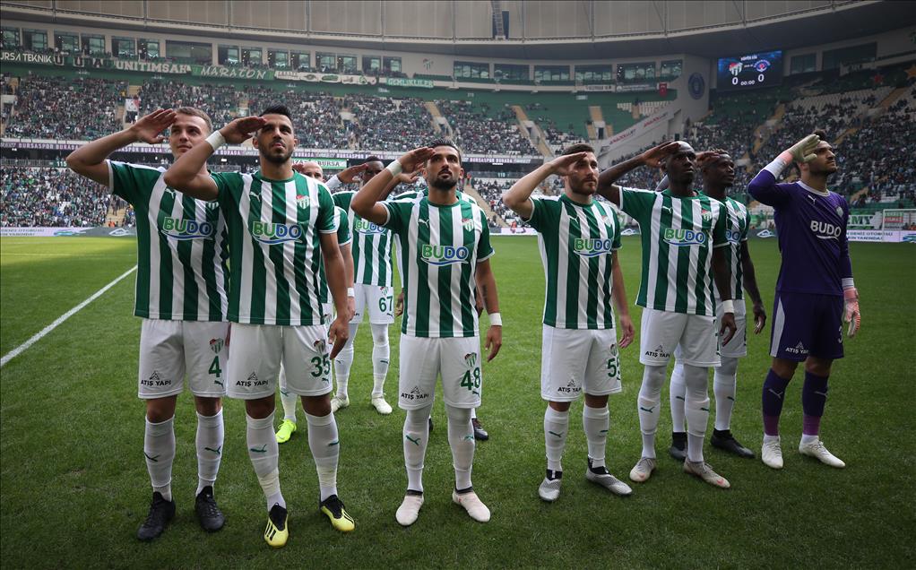 Spor Toto Süper Ligi'nde Bursaspor ile Kasımpaşa takımları Bursa Büyükşehir Belediye Stadyumu'nda karşılaştı. Bursasporlu futbolcular, Afrin'de şehit olan Taner Çobanoğlu'nun maça gelen ailesine asker selamı verdi. ( Ali Atmaca - Anadolu Ajansı )Ali Atmaca