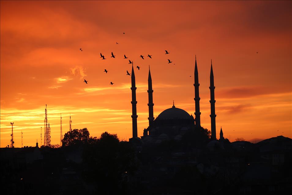 Mimar Sinan'ın ustalık eseri Selimiye Camisi'nin silüeti, tan vaktinde kızıla çalan gökyüzü ve bulutlarla birlikte görenleri büyülüyor. ( Salih Baran - Anadolu Ajansı )Salih Baran