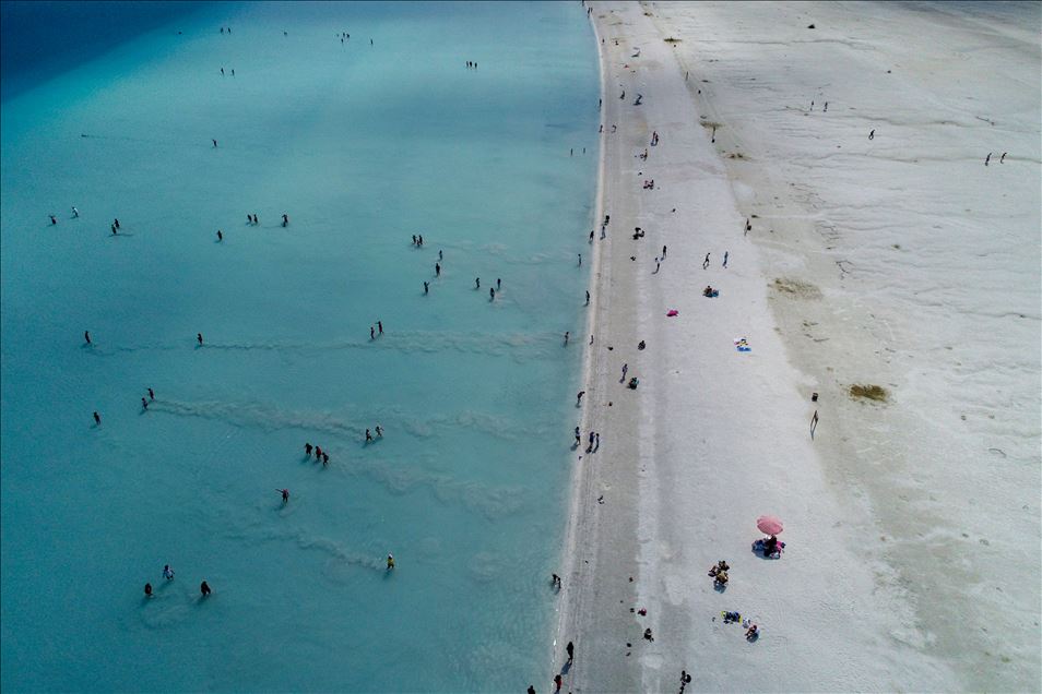 Türkiye'nin üç tarafındaki denizlere kıyısı olan kentlerin dışında Anadolu'nun ortasında bulunan şehirlerde yer alan göl ve akarsuların çevresindeki plajlar da görülmeye değer güzellikleriyle ilgi çekiyor. Akdeniz, Ege, Marmara ve Karadeniz ile üç tarafı engin sularla çevrili Türkiye'nin sahilleri turistler tarafından tercih ediliyor. Sahil kentleri dışında Anadolu'nun ortasında yer alan "bozkır" şehirlerindeki göl ve akarsularda kendiliğinden oluşan kumsallar da görsel güzellikleriyle rağbet görüyor. Fotoğrafta Burdur'un Yeşilova ilçesinde yer alan tektonik bir çukurun üzerinde ve kapalı bir havzada bulunan 184 metre derinliğinde, 6,8 kilometre eninde, 9,18 kilometre uzunluğundaki Salda Gölü görülüyor. ( Mustafa Çiftçi - Anadolu Ajansı )Mustafa Çiftçi