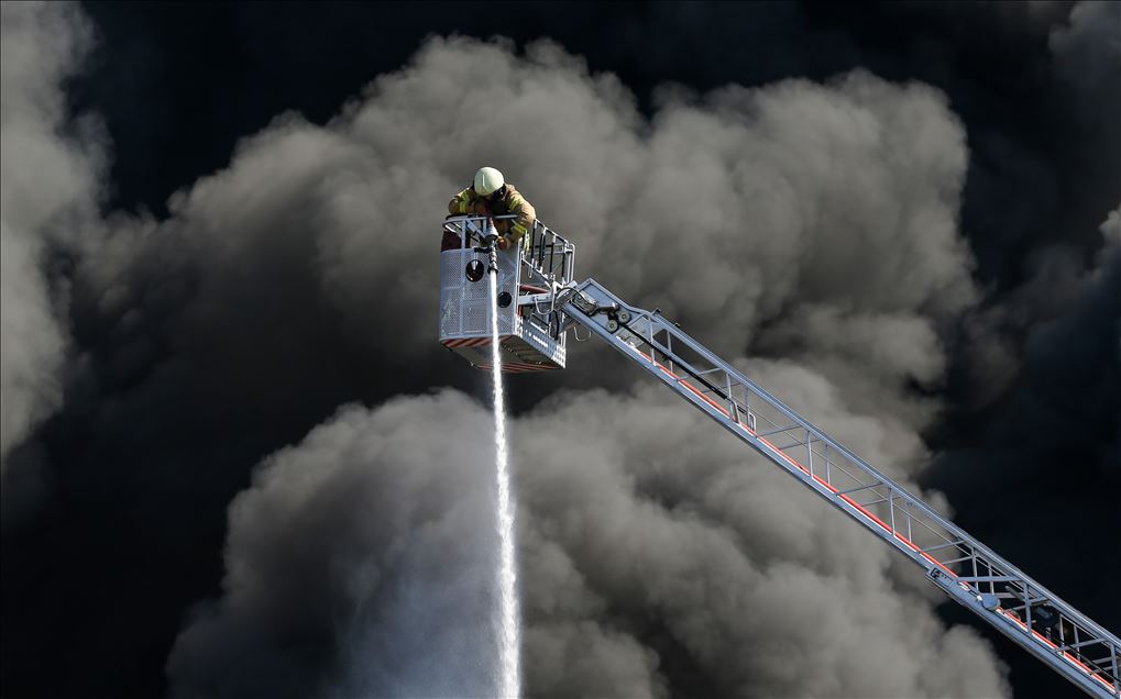 Tuzla'da bir deri fabrikasında çıkan yangına müdahale, çevre ilçelerden gelen itfaiye ekiplerinin desteğiyle sürüyor. ( İslam Yakut - Anadolu Ajansı )İslam Yakut