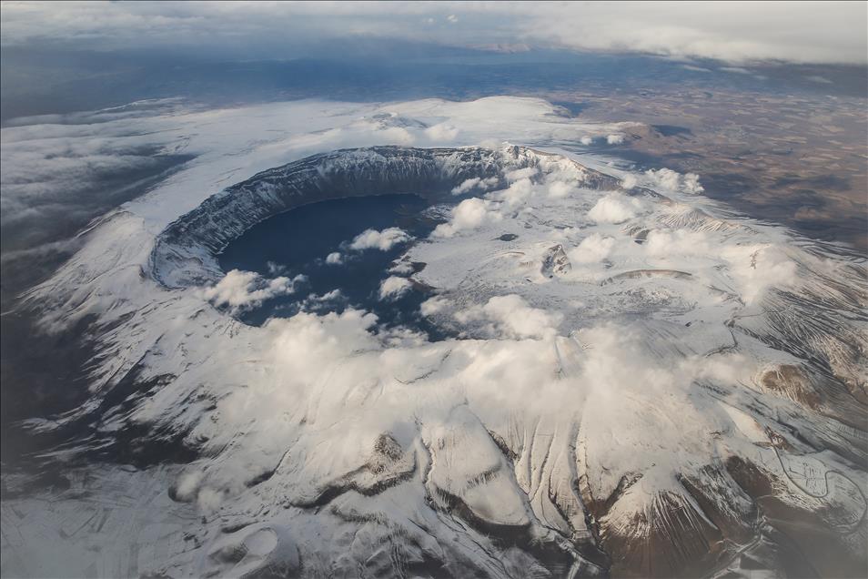 Yerden yaklaşık 10 bin metre yükseklikte yapılan uçak seyahati esnasında yolcular, Doğu Anadolu Bölgesi'nde beyaza bürünen karlı dağları gökyüzünden izleme imkanı buluyor. Fotoğrafta, Bitlis sınırlarındaki Nemrut Dağı ve üzerindeki Nemrut Krater Gölü görülüyor. ( Özkan Bilgin - Anadolu Ajansı )Özkan Bilgin