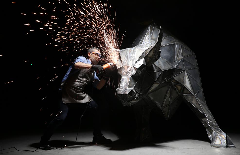 Bursa'da metal üzerine faaliyet gösteren atölye sahibi Rıdvan Sevim öncülüğünde 12 kişilik ekiple hazırlanan boğa heykeli, sosyal sorumluluk projesi kapsamında Azerbaycanlı bir iş adamına gönderilecek ve karşılığında 50 engelliye akülü tekerlekli sandalye alınacak. ( Ali Atmaca - Anadolu Ajansı )Ali Atmaca