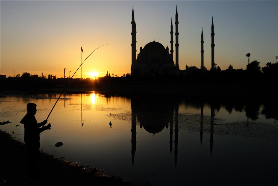 Adana Sabancı Merkez Camisi, gün batımında Seyhan Nehri üzerine yansıması güzel görüntü oluşturdu. Bazı vatandaşlar nehrin kenarında balık tuttu. ( Burak Milli - Anadolu Ajansı )Burak Milli