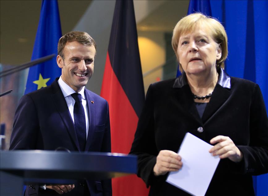Almanya Başbakanı Angela Merkel (solda), 1. Dünya Savaşı'nda hayatını kaybedenlerin anıldığı törene katılmak üzere Almanya'nın başkenti Berlin'e gelen Fransa Cumhurbaşkanı Emmanuel Macron (solda) ile başbakanlık binasında bir araya geldi. Merkel ve Macron ikili görüşme öncesinde ortak basın toplantısı düzenledi. ( Abdülhamid Hoşbaş - Anadolu Ajansı )Abdülhamid Hoşbaş