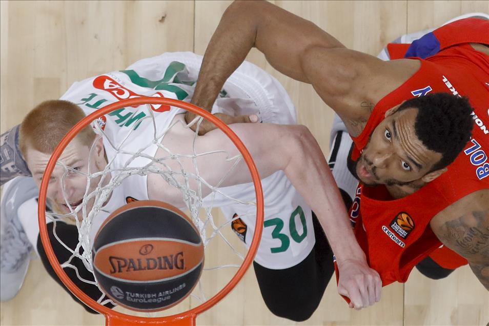 THY Avrupa Ligi'nde CSKA Moskova ile Zalgiris Kaunas takımları Rusya'nın başkenti Moskova'da karşılaştı. Bir pozisyonda CSKA Moskova oyuncusu Joel Bolomboy (sağda), Zalgiris Kaunas oyuncusu Aaron White (solda) ile mücadele etti.