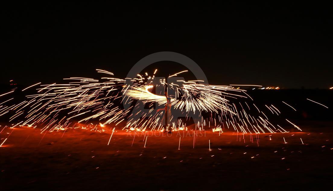 Abluka altındaki Gazze Şeridi'nde "Büyük Dönüş Yürüyüşü" eylemleri kapsamında Gazze kentinin Şucaiyye Mahallesi doğusunda İsrail sınırında toplanan bir grup, İsrail karşıtı sloganlar atarak gösteri düzenledi. Gösteri sırasında Filistinli bir genç ''kıvılcım saçar'' çevirdi. ( Ali Jadallah - Anadolu Ajansı )Ali Jadallah
