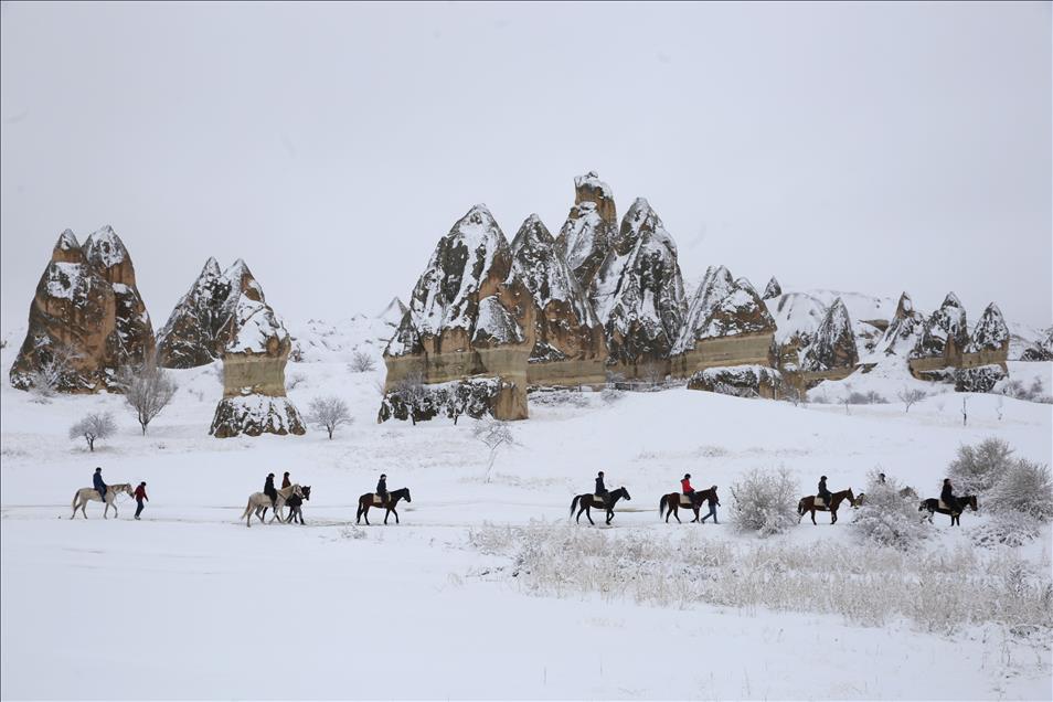 Kar yağışı sonrası beyaz bürünen Kapadokya'da, turistler çeşitli aktivitelerle karın keyfini çıkardı. Kar yağışının ardından karla kaplanan peribacaları arasında düzenlenen atlı tura katılan turistler, Kılıçlar, Güllüdere ve Zemi vadilerinde gezinti yaptı. ( Behçet Alkan - Anadolu Ajansı )Behçet Alkan