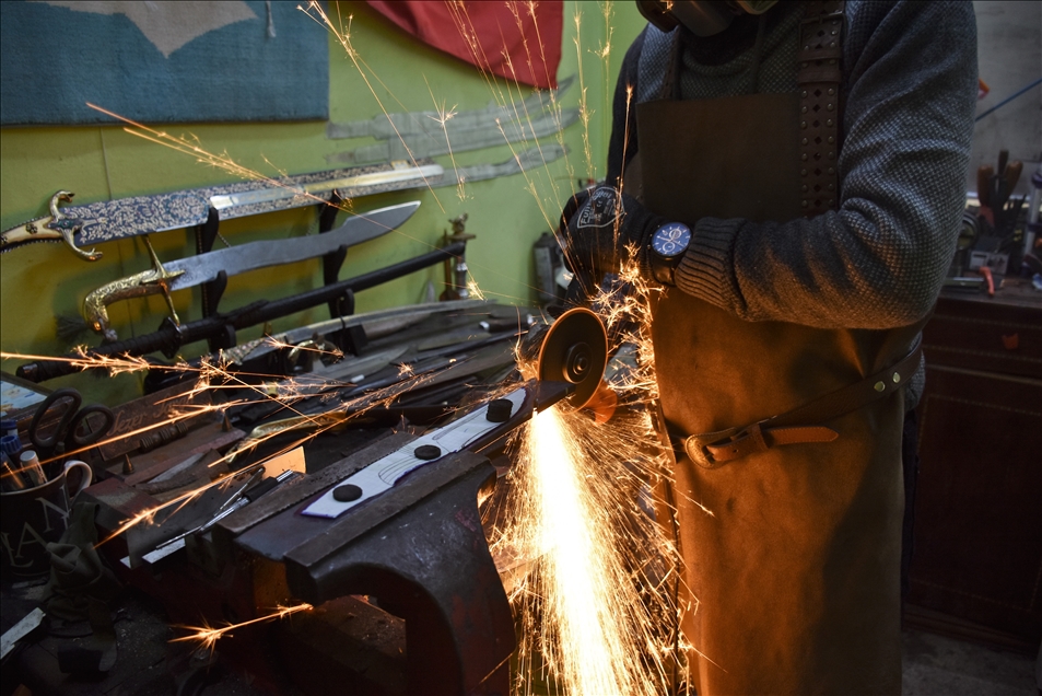 Bilecik'te bir seramik fabrikasında iklimlendirme ustası olarak çalışan Sezer Sargıl, hurda demir ve çelik parçalarından işlemeli kılıç, bıçak ve kılıf üretiyor. ( Tayyib Hoşbaş - Anadolu Ajansı )Tayyib Hoşbaş