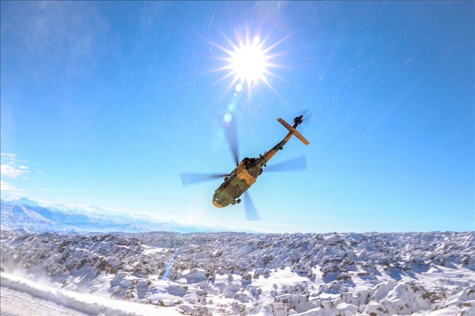 Sarp dağlar ve karla kaplı arazilerde daha önce PKK'lı teröristlerin geçiş güzergahı olarak kullandığı alanları kontrol altında tutan askerler, Atak helikopterlerinin de destek verdiği başarılı operasyonlarla terör örgütüne ağır darbeler vuruyor. ( Özkan Bilgin - Anadolu Ajansı )Özkan Bilgin