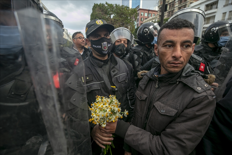 Tunus'ta yeni tip koronavirüs (Kovid-19) tedbirlerine karşı bir haftadan bu yana devam eden gösterilerde gözaltına alınan kişilerin serbest bırakılması talebiyle başkent Tunus'un merkezindeki Habib Burgiba Caddesi'nde toplanan Tunuslular, gösteri düzenledi. Bir vatandaş, bölgede önlem alan polise çiçek verdi. ( Yassine Gaidi - Anadolu Ajansı )Yassine Gaidi