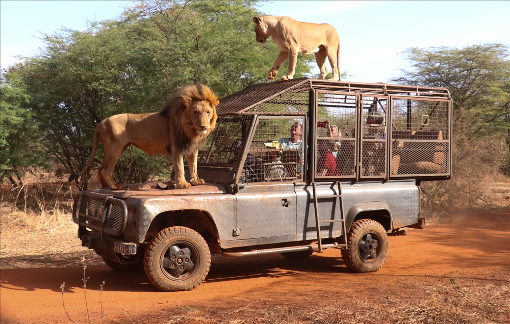 Senegal'deki doğal yaşam parkının ziyaretçileri, aslanları yakından görebilmek için "kafese" giriyor