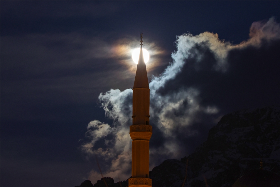 Van'da akşam saatlerinde Erek Dağı'nın arkasından beliren dolunay, minare ve bulutlarla güzel görüntü oluşturdu. ( Özkan Bilgin - Anadolu Ajansı )Özkan Bilgin