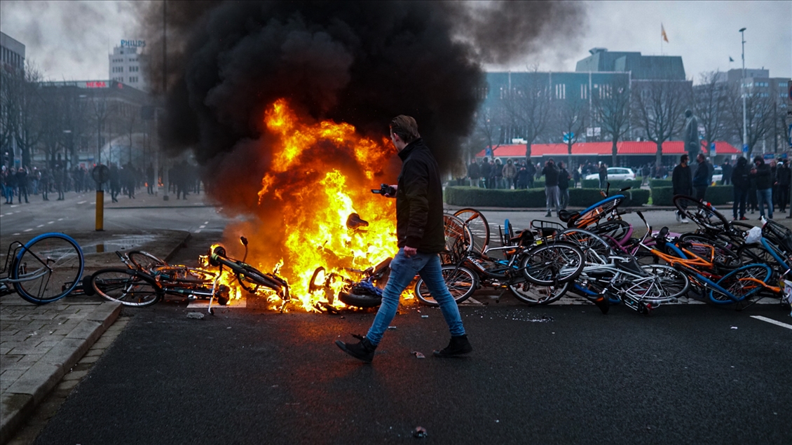 Hollanda'da yeni tip koronavirüsle (Kovid-19) mücadele için uygulanan tedbirler ve sokağa çıkma kısıtlamalarına karşı Amsterdam ve Eindhoven kentlerinde protesto gösterileri düzenlendi. Eindhoven kentindeki 18 Eylül Meydanı'nda toplanan göstericilere zırhlı polisler müdahale etti. ( Stringer - Anadolu Ajansı )Stringer