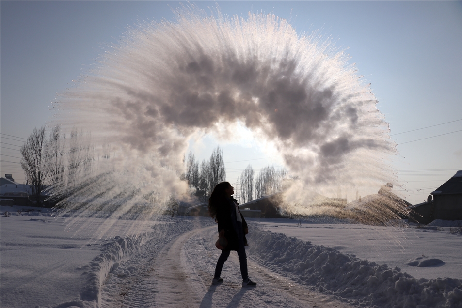 Hava sıcaklığının sıfırın alında 33 derece olduğu Ağrı'da, havaya serpilen kaynar suyun donduğu anlar güzel görüntüler oluşturdu. Dondurucu soğukların etkisi altındaki kentte, bazı vatandaşların evlerinde kaynatarak havaya attığı suyun yere düşmeden donduğu anlar görsel şölene dönüştü. ( Abdullah Söylemez - Anadolu Ajansı )Abdullah Söylemez