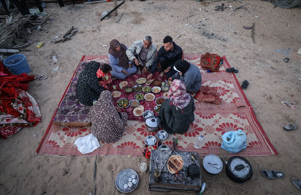 İsrail'in Gazze Şeridi'ne yönelik saldırıları sonucu evleri tamamen yıkılan Filistinli Hamude Ebu Amre (ortada) ailesi, ramazan ayının üçüncü gününde oruçlarını boş arazide kurdukları yer sofrasında açtı. ( Ali Jadallah - Anadolu Ajansı )Ali Jadallah