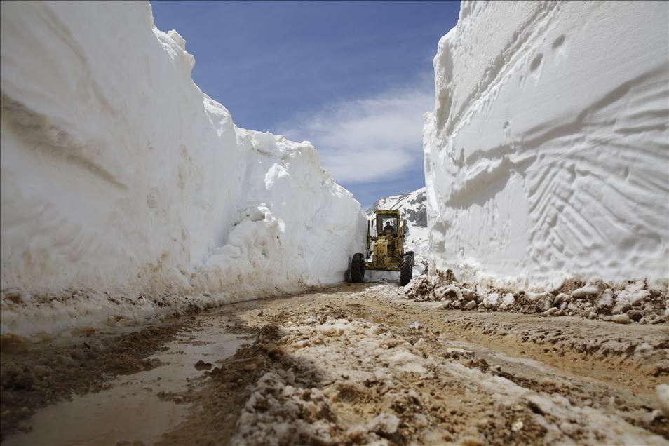 Antalya'nın Gündoğmuş ilçesindeki 2 bin 500 rakımlı Söbüçimen Yaylası'nda yer yer 8 metreyi bulan karla kaplı yollar, ekipler tarafından yazın yaylalara göçen hayvancıların ulaşımına açılmaya çalışılıyor. ( AA - Anadolu Ajansı )AA