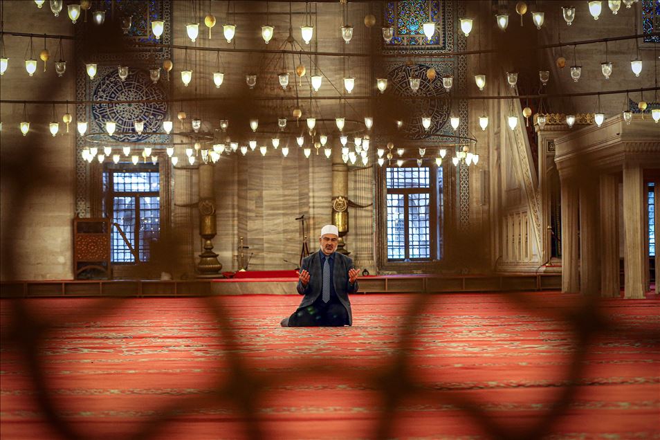 Mimar Sinan'ın sadeliği estetikle ihtişama dönüştürdüğü Süleymaniye Cami, dünyayı etkisi altına alan koronavirüs salgını sebebiyle tarihi bir sessizlik yaşıyor. Salgın nedeniyle alınan tedbirler kapsamında cami ve mescitlerde cemaatle namaz kılınmasının geçici olarak kısıtlanmasının ardından Süleymaniye Camisi, eski yoğun günlerinden uzak bir görüntü çiziyor. Caminin müezzini Mehmet Koçyiğit, kısıtlamanın başlamasından bu yana ezan okuduktan sonra ibadetlerini yalnız yapıyor. ( Mehmet Eser - Anadolu Ajansı )Mehmet Eser