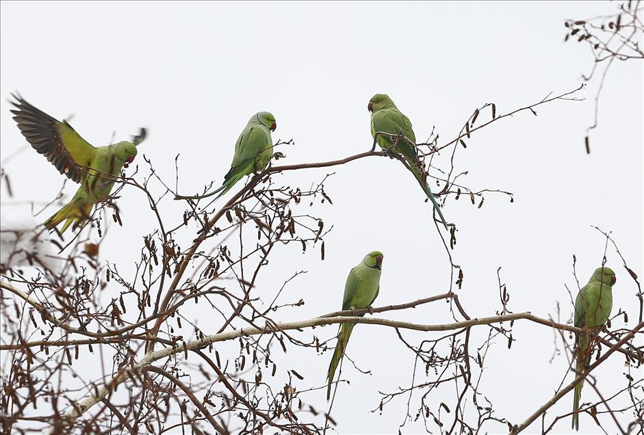 Ankara'nın çeşitli yerlerinde görülen ve kökeni tropikal Asya ile Afrika olan yeşil papağanlar, bu kez TBMM Bahçesi'nde görüntülendi. ( Halil Sağırkaya - Anadolu Ajansı )Halil Sağırkaya