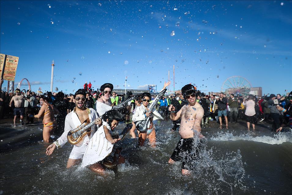 Yeni yılın ilk gününde soğuk havaya aldırış etmeyen New Yorklular, Brooklyn’deki Coney Island kumsalında denize girdi.