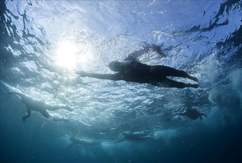 Türkiye Yüzme Federasyonu (TYF) onaylı Türkiye'nin ilk Kış Kupası Açık Su Yüzme Yarışları, İzmir'in Menderes ilçesinde yapıldı. 2018 Marathon Masters Kış Kupası Açık Su Yüzme Yarışları'na 19'u kadın 100 sporcu katıldı. ( Murat Kaptan - Anadolu Ajansı )Murat Kaptan