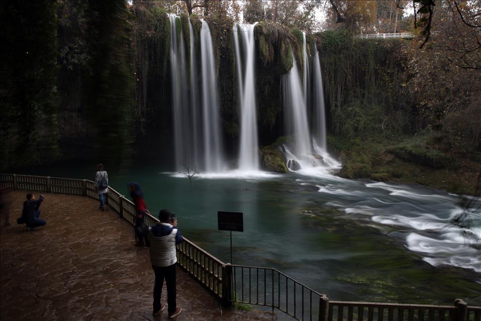 Dünyanın önemli doğal güzellikleri arasında yer alan ve her yıl 400 bin yerli ve yabancı turistin ziyaret ettiği Düden Şelalesi, renk cümbüşü ve gürül gürül akan suyuyla kışın da turistlerin gözdesi. Antalya kent merkezine 10 kilometre uzaklıkta bulunan ve kaynağını Kepez Hidroelektrik Santrali'nden alan şelaleyi, Çin'den Japonya'ya, Filistin'den Rusya'ya, Amerika'dan Almanya'ya farklı ülkelerden binlerce turist ziyaret ediyor. Yazın serinlemek, doğayla baş başa kalmak için çok tercih edilen Düden Şelalesi, kışın da misafirlerini ağırlıyor. Kırmızı, turuncu, yeşil, sarı, kahverengi renklerininin cümbüş oluşturduğu şelalede, ziyaretçiler fotoğraf çektiriyor, ırmağın kenarında saatlerce oturup, şelaleyi izliyor. ( Orhan Çiçek - Anadolu Ajansı )Orhan Çiçek