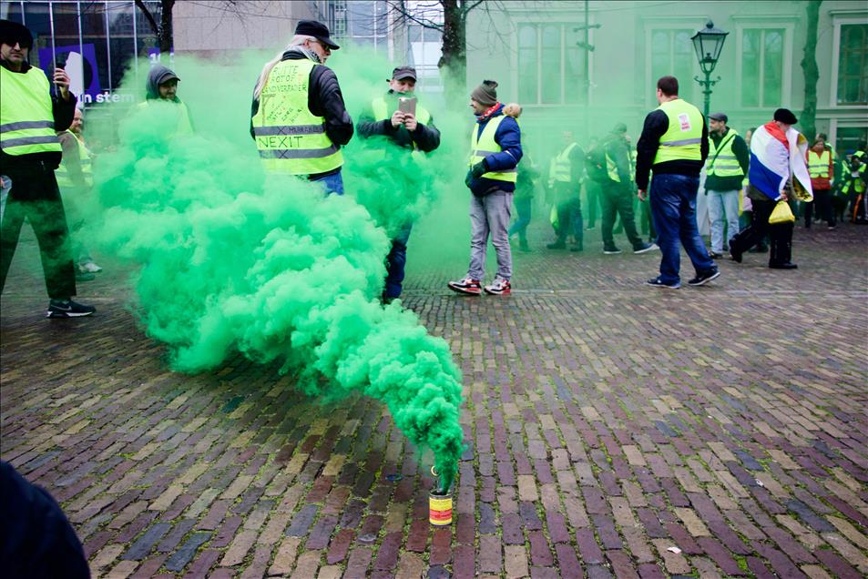 Hollanda'da "sarı yelekliler"in protesto gösterisinde 5 kişi gözaltına alındı. Sarı yelekliler, sosyal medyadan yapılan çağrılar üzerine bu kez Hollanda Parlamentosu önünde toplandı. Yaklaşık 200 kişinin katıldığı gösteride, sarı yelekliler, Parlamento'dan şehir merkezine yürüdü. Genellikle aşırı sağcı grupların yer aldığı gösteride polis ile sarı yelekliler arasında arbede yaşandı. ( Abdullah Aşıran - Anadolu Ajansı )Abdullah Aşıran