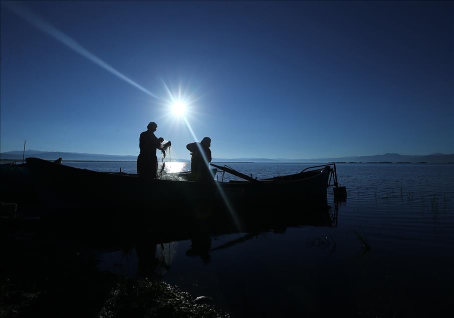 Konya'nın Seydişehir ilçesindeki Suğla Gölü’nde, 15 yıldır balıkçılık yapan Aynur ve Hasan Yıldırım çifti, gün doğmadan "Vira bismillah" diyerek balık tutup kazançlarını sağlıyor. ( Abdullah Coşkun - Anadolu Ajansı )Abdullah Coşkun