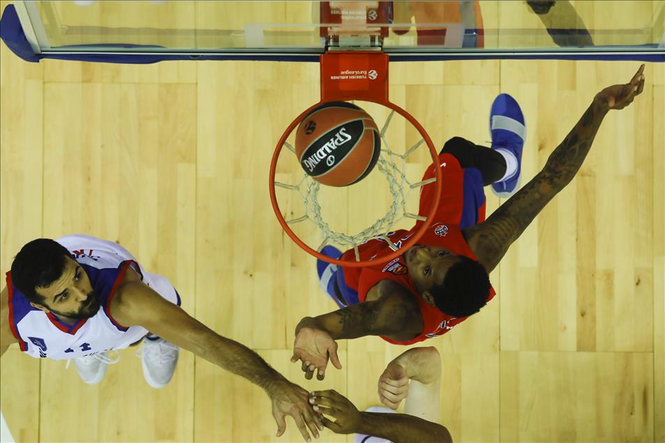 Rusya'nın başkenti Moskova'da düzenlenen Alexander Gomelsky's Cup basketbol turnuvasına katılan Anadolu Efes, CSKA Moskova ile final maçında karşılaştı. Anadolu Efes oyuncusu Adrien Moerman (solda) rakibi ile mücadele etti. ( Sefa Karacan - Anadolu Ajansı )Sefa Karacan