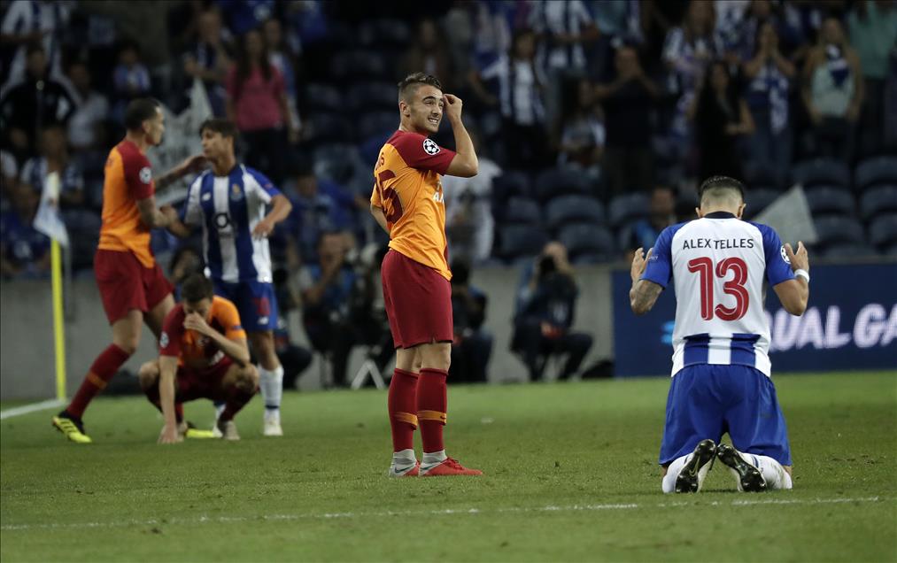 UEFA Şampiyonlar Ligi D Grubu 2. hafta mücadelesinde, Porto ile Galatasaray takımları Porto’daki Dragao Stadı'nda karşı karşıya geldi. Karşılaşmayı kazanan Porto takımının futbolcularından Alex Telles (sağda) sevinç yaşarken, Galatasaraylı futbolcu Yunus Akgün (sağ 2) üzüntü yaşadı.