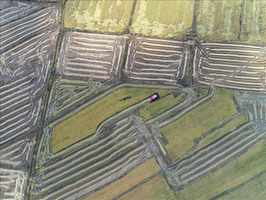 Türkiye'deki çeltik üretiminin yüzde 45'ini yaptığı için "çeltik ambarı" olarak bilinen Edirne'de hasadın başladığı zamana denk gelen sağanaklar nedeniyle mola verilen biçme işlerine yeniden başlandı. ( Hakan Mehmet Şahin - Anadolu Ajansı )Hakan Mehmet Şahin