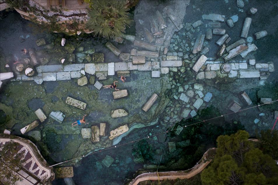Beyaz travertenleri, binlerce yıllık tarihi ve doğal güzellikleriyle Türkiye'nin önemli turizm merkezlerinden Denizli, yarıyıl tatilinde termal sularda şifa arayanların ilgi odağı oluyor. UNESCO Dünya Mirası Listesi'nde yer alan "beyaz cennet" Pamukkale de ziyaretçilerin vazgeçemediği turistik mekanların başında geliyor. Hierapolis'teki "Kleopatra Havuzu", Denizli'nin ziyaretçilerine unutulmaz bir anı yaşattığı yerler arasında bulunuyor. Milattan sonra 692'de meydana gelen depremde sütunların yıkılması ve termal suyun birikmesiyle doğal yollarla oluşan havuzdaki su, o yıllardan bu yana 36 derecelik sıcaklığını hiç yitirmedi. Mısır Kraliçesi Kleopatra'nın yıkandığı rivayet edilen havuza girenler, 2 bin yıllık sütun ve mermer kalıntıları arasında binlerce yıl öncesine kulaç atma heyecanı yaşıyor. Havuzdaki suyun kalp damar hastalıkları, romatizma, deri, felç ve sinir hastalıkları ile içildiğinde mide ve bağırsak rahatsızlıklarına iyi geldiğine inanılıyor. ( Emin Mengüarslan - Anadolu Ajansı )Emin Mengüarslan
