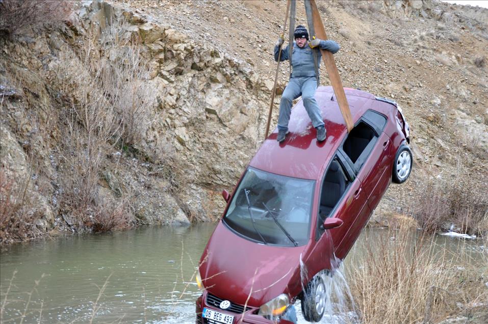 Yozgat'ın Sorgun ilçesinde aynı noktada meydana gelen 3 ayrı trafik kazasında, kazazedelerden biri, su birikintisine düşen aracın kadın sürücüsünü boğulmak üzereyken kurtardı. ( Şahin Özmen - Anadolu Ajansı )Şahin Özmen