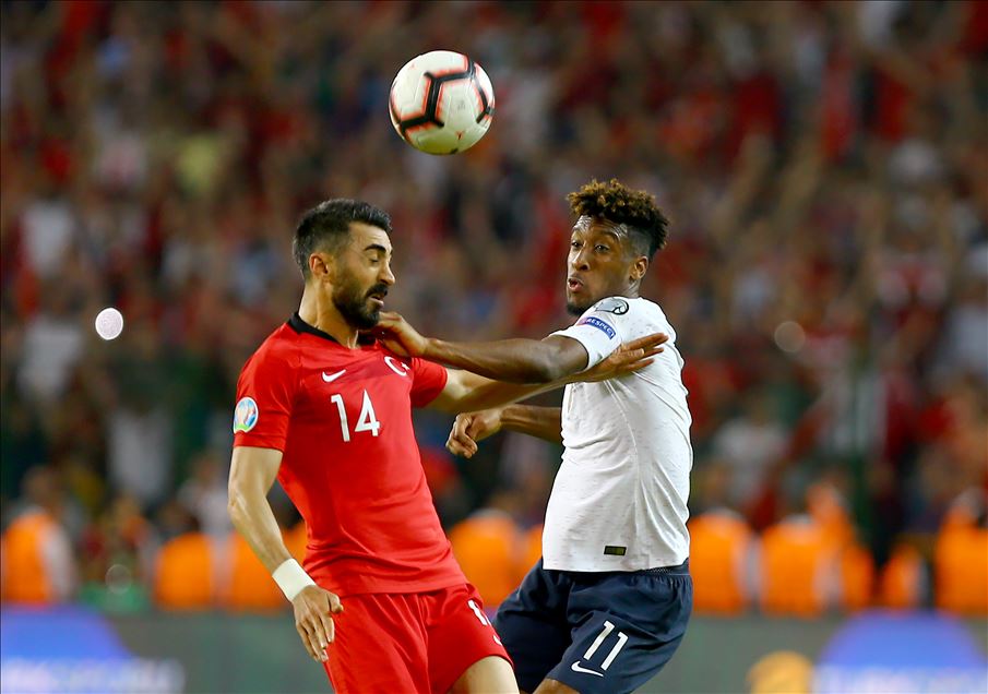 Türkiye A Milli Futbol Takımı, Fransa ile 2020 Avrupa Futbol Şampiyonası elemeleri H Grubu'nda, Konya Büyükşehir Belediye Stadyumu’nda karşılaştı. Bir pozisyonda, Türkiye Milli Takım oyuncusu Mahmut Tekdemir (14) ile Fransa Milli Takım oyuncusu Kingsley Koman (11) mücadele etti.