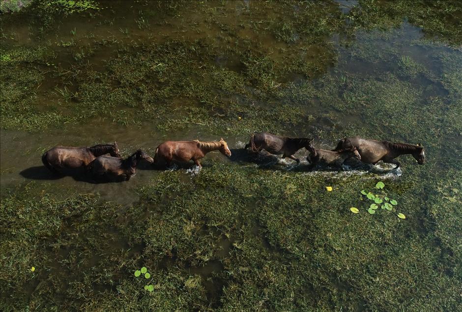 Konar göçer Yörükler tarafından Bursa'nın Karacabey ilçesine getirilip doğaya salındığı bilinen, bir asırdır yaşamlarını Karacabey Longozu'nda (su basar ormanı) yabani olarak sürdüren Orta Asya kökenli atların bölgede doğayla uyumları, birlikte hareket etmeleri dikkati çekiyor. ( Ali Atmaca - Anadolu Ajansı )Ali Atmaca