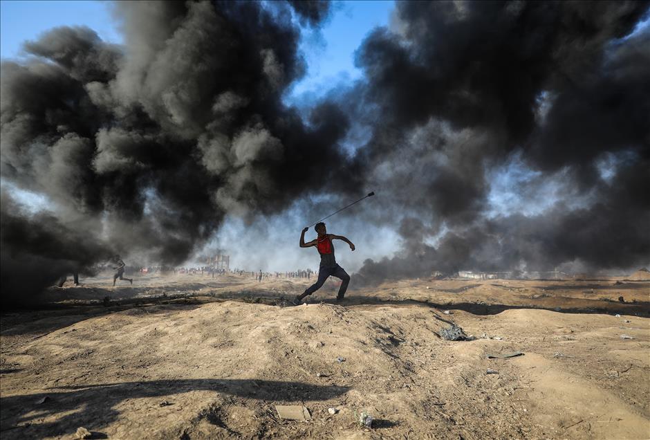 İsrail ablukası altında yıllardır büyük bir insani kriz yaşayan Gazze Şeridi'nde 30 Mart'tan bu yana süren barışçıl Büyük Dönüş Yürüyüşü gösterileri bugün de devam etti. Gazze kentinin doğusundaki İsrail sınırında toplanan Filistinliler, "Yüzyılın Anlaşmasını düşürmek, ablukayı kırmak için birlik" adı verilen Büyük Dönüş Yürüyüşü'nün 15. cumasındaki gösterilere katıldı. Sınırın diğer tarafındaki İsrail güçlerinin gösteriye müdahale etmesi üzerine göstericiler, lastik yakarak ve sapanla taş atarak karşılık verdi. ( Mustafa Hassona - Anadolu Ajansı )Mustafa Hassona