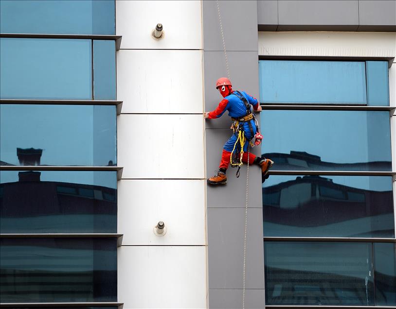 Zorlu meslekler arasında yer alan dış cephe cam temizliğini iş olarak seçen 47 yaşındaki Tamer Uysal, 4 yıldır "örümcek adam" kostümüyle yerden onlarca metre yükseklikte bir ipin ucuna bağlı çalışıyor. Eskişehir'de yüksek binaların cam temizliğini ve tabela montajını yapan Tamer Uysal, 30 yıl kadın kuaförlüğü yaptıktan sonra işletmesini eşine devrederek 4 yıl önce bu mesleği seçti. İki çocuk babası Uysal, dağcılık tutkusunu yaptığı işe uyarlayarak, ekmeğini yükseklerde kazanıyor. ( Emrah Yaşar - Anadolu Ajansı )Emrah Yaşar